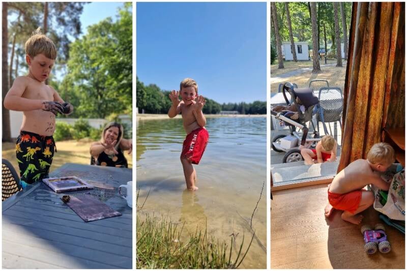 De eerste dag van de zomervakantie begon in het bospark Wolfsven van Roompot. We konden ons incheck kaartje via een kluisje met code ophalen bij de ingang en konden zo met de auto het park op. Makkelijk en snel. Vol spanning zochten de kinderen mee naar ons huisje en die was niet ver van de ingang. Toen we aankwamen waren er voor ons deurtje al een aantal kinderen aan het spelen op een klein speeltoestelletje met glijbaan. De kinderen lieten nog net niet de tassen vallen om zich aan het groepje toe tevoegen. Papa en mama konden zo in alle rust alle spulletjes uitladen en een plekje geven. Wij vonden het een enorm pluspunt dat de kinderen voor de deur konden spelen. Zo konden zij hun eigen gang gaan terwijl ik bezig was met koken of de baby. Ook met de middag dutjes was het fijn dat de baby in haar eigen bedje kon liggen zonder dat de jongens daar last van hadden.